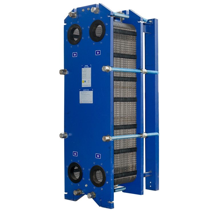 L'échangeur de chaleur de plat se compose d'un paquet de plaques de métal ondulées avec des hublots pour le passage des deux fluides entre lesquels le transfert de chaleur aura lieu. Le paquet de plat est assemblé entre un plat de cadre de difficulté et une plaque de pression mobile et comprimé en serrant des boulons. Les plats sont équipés d'une garniture qui scelle le canal inter de plat et dirige les fluides dans les canaux alternatifs. Le nombre de plats est déterminé par le débit, les propriétés physiques des fluides, la chute de pression et le programme de la température. Les plissements de plat favorisent la turbulence liquide et soutiennent les plats contre la différence de pression. Le plat de cadre et la plaque de pression sont suspendus d'une barre de transport supérieure et situés près d'une barre de guidage inférieure, qui sont fixées à une colonne de soutien. Des connexions sont situées dans le plat de cadre ou, si ou les deux fluides font plus qu'un monopasse dans l'unité, dans le cadre et les plaques de pression.