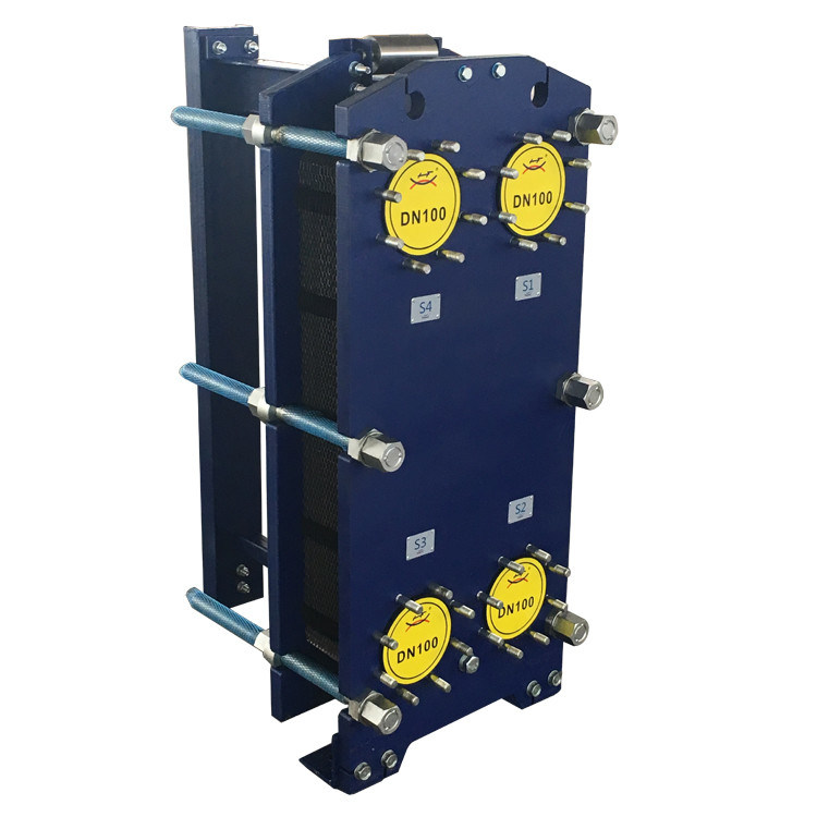 L'échangeur de chaleur de plat se compose d'un paquet de plaques de métal ondulées avec des hublots pour le passage des deux fluides entre lesquels le transfert de chaleur aura lieu. Le paquet de plat est assemblé entre un plat de cadre de difficulté et une plaque de pression mobile et comprimé en serrant des boulons. Les plats sont équipés d'une garniture qui scelle le canal inter de plat et dirige les fluides dans les canaux alternatifs. Le nombre de plats est déterminé par le débit, les propriétés physiques des fluides, la chute de pression et le programme de la température. Les plissements de plat favorisent la turbulence liquide et soutiennent les plats contre la différence de pression. Le plat de cadre et la plaque de pression sont suspendus d'une barre de transport supérieure et situés près d'une barre de guidage inférieure, qui sont fixées à une colonne de soutien. Des connexions sont situées dans le plat de cadre ou, si ou les deux fluides font plus qu'un monopasse dans l'unité, dans le cadre et les plaques de pression.